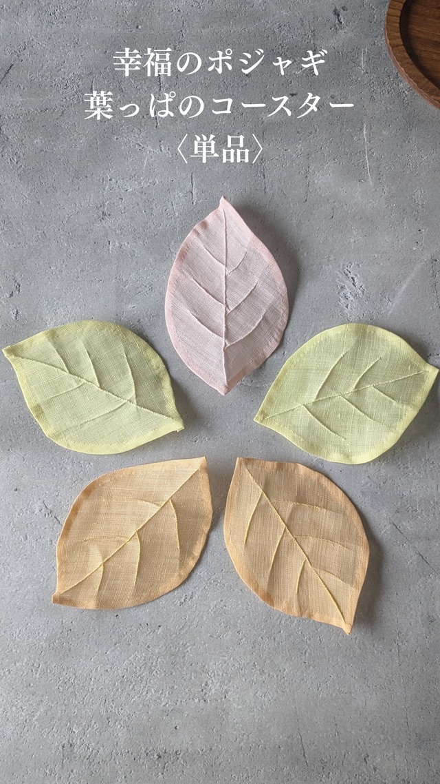 かわいい葉っぱのコースターに 春らしいカラフルな色が登場しました♡ お茶に添えてあるだけで、ちょっと幸せな気持ちにしてくれる幸福のアイテムです。 作り手が一重縫いで一針一針、丁寧に縫い上げております。 手縫いのため、サイズやデザインに個体差がございますが、ご理解くださいますようお願いします。 ◆サイズ:約16×10cm ◆カラー:ピンク色、黄色、みかん色 ◆素 材:麻(モシ) ※小さい商品のみご購入の場合は「ネコポス」での発送となります。 カーテンを一緒にご購入のお客様は「コンパクト便」にまとめて発送させていただきます。 ※お使いのパソコン・スマートフォン・タブレット等のデバイスにより、色や質感の見え方が異なる場合がございますが、ご了承いただきますようお願いいたします。
